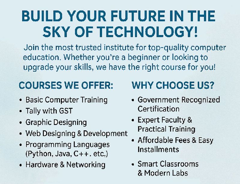 We provide top-quality computer education designed to meet the needs of beginners as well as advanced learners. Our courses With expert trainers, government-recognized certification, and hands-on training, we prepare you for success in the digital world.